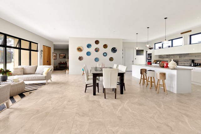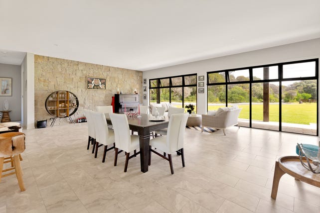 Open-plan kitchen and dining flowing through to a sunken lounge, looking out over the lush lawns gives a very relaxed feeling of spaciousness.