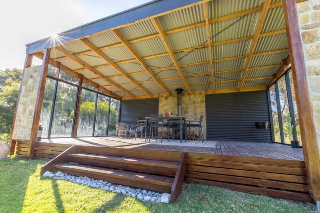 A conservatory for outdoor entertainment area, looking over bushland. A wood fire heater and oven for Sunday afternoons.